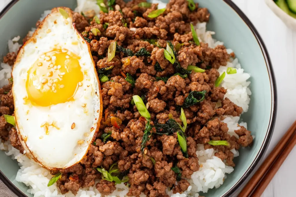 Korean ground beef is seasoned with a savory-sweet sauce made from soy sauce, brown sugar, sesame oil, and ginger. These bold flavors set it apart from plain cooked ground beef.